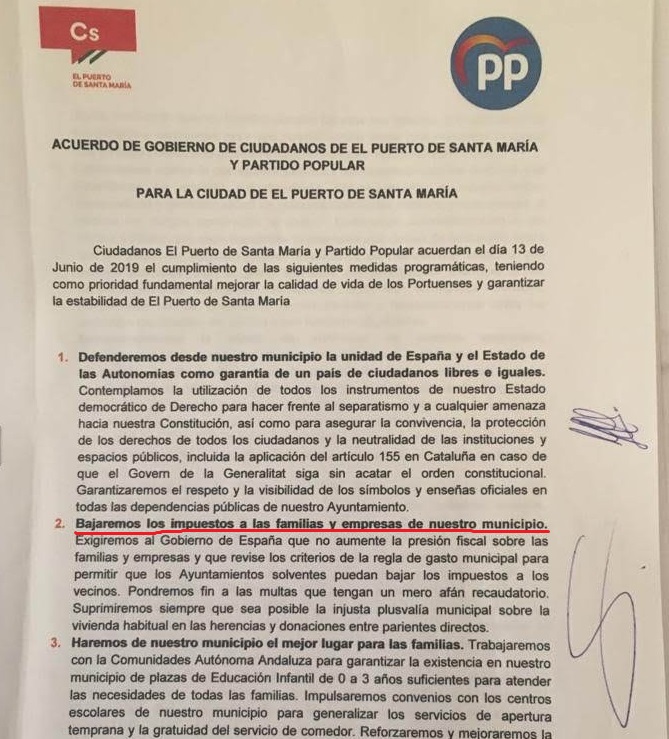 Asimismo, en el punto 2 del acuerdo de gobierno entre el PP y Cs, ambas formaciones prometieron, literalmente, lo siguiente: “Bajaremos los impuestos a las familias y empresas de nuestro municipio”.