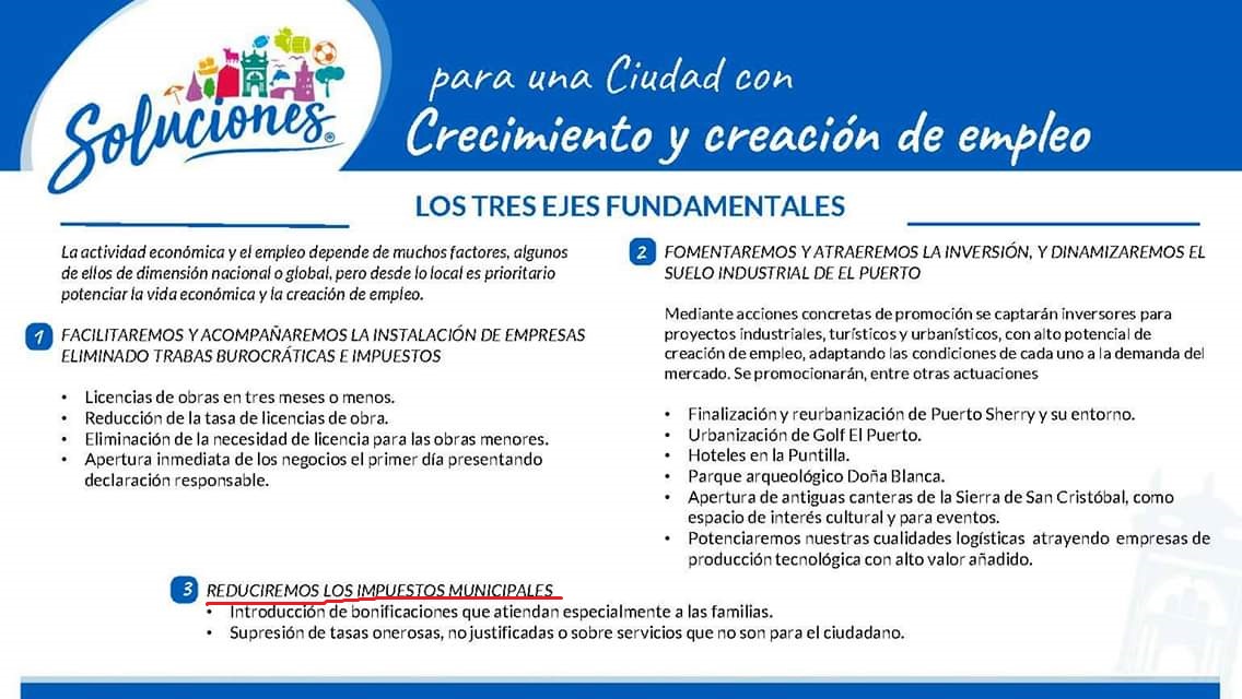 Y es que como asegura el PSOE “lo cierto y claro es que, en 2019, durante su larga campaña de videos y marketing, el entonces “hola soy Germán” prometió que el “segundo eje fundamental de soluciones para El Puerto” si llegara a gobernar sería una reducción de todos los impuestos y tasas; llegando a asegurar que la propuesta estaba estudiada y lista para aplicar”.