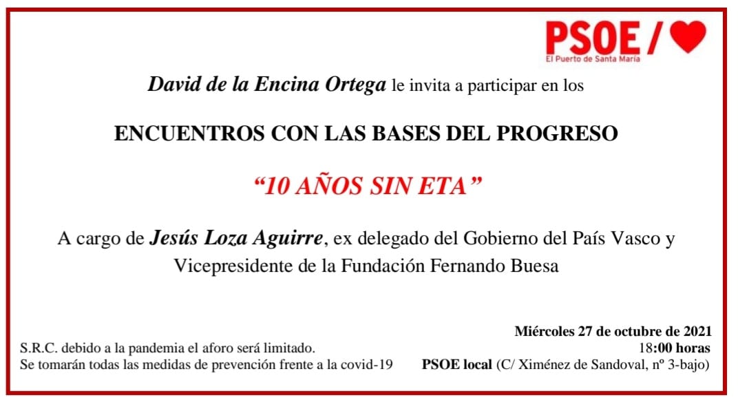 La sede local del PSOE acogerá el próximo miércoles 27 de octubre desde las 18 horas, una interesante charla sobre los 10 años sin ETA; efeméride que acaba de cumplirse. En un acto abierto a la ciudadanía el socialista Jesús Loza Aguirre abordará los aspectos fundamentales de estos años y las consecuencias que debemos sacar de cara al futuro.