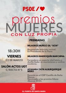 Este viernes 22 de marzo celebramos el acto de entrega de los premios Mujeres con Luz Propia, que, con motivo del Día Internacional de la Mujer, convocamos cada año para reconocer “la trayectoria de aquellas portuenses que, desde diferentes ámbitos, dan lo mejor de sí mismas para hacer de nuestra sociedad un lugar mejor”.