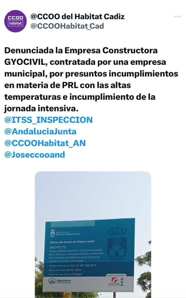 Según ha indicado el secretario general y portavoz Ángel González “los trabajadores, a través de CCOO, han interpuesto una denuncia en Inspección de Trabajo contra la empresa Gyocivil por incumplimiento en materia de Prevención de Riesgos Laborales, ya que las condiciones a las que están sometidos incumplen la Ley de Prevención de Riesgos Laborales. En concreto, se trata del incumplimiento de la jornada intensiva con las altas temperaturas que estamos registrando”.