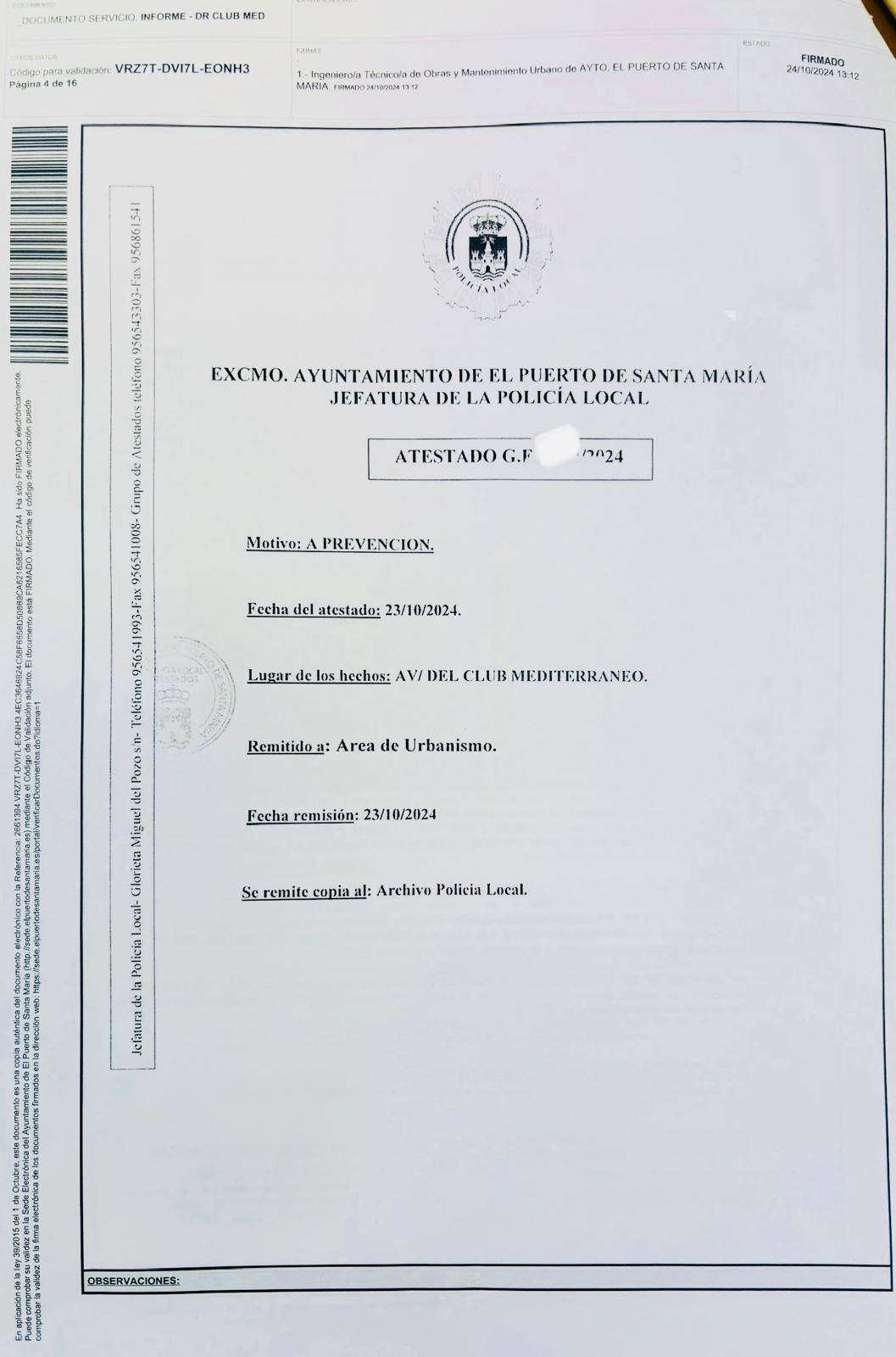 Según ha podido conocer la formación, el día 23 de octubre se personan agentes de la Policía Local en la avenida del Club Mediterráneo, donde comprueban las infracciones en materia de tráfico que son competencia de la propia Policía Local, los cuales levantan un atestado “a prevención” archivando el informe y remitiéndolo exclusivamente a Urbanismo, pero no sancionando en materia de tráfico.