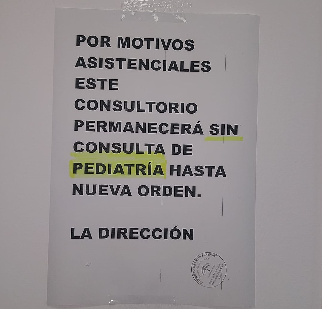 Como ha explicado Ángel González “un vergonzoso cartel en el consultorio, informa a los usuarios de que ‘por motivos asistenciales este consultorio permanecerá sin consulta de pediatría hasta nueva orden’, dando la impresión de que es una situación meramente temporal y sobrevenida, cuando la realidad es que llevan años sin este servicio y no parece que vaya a haber solución en breve”.